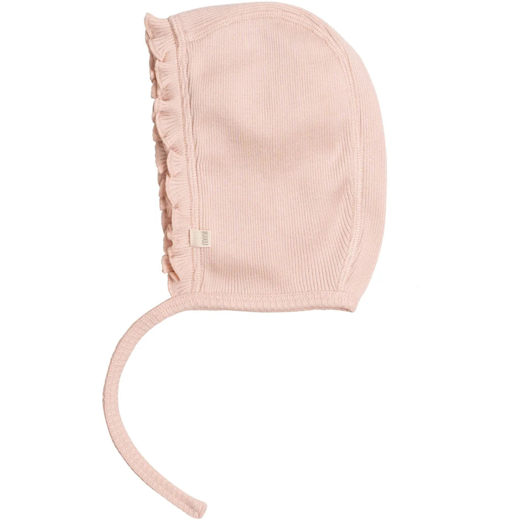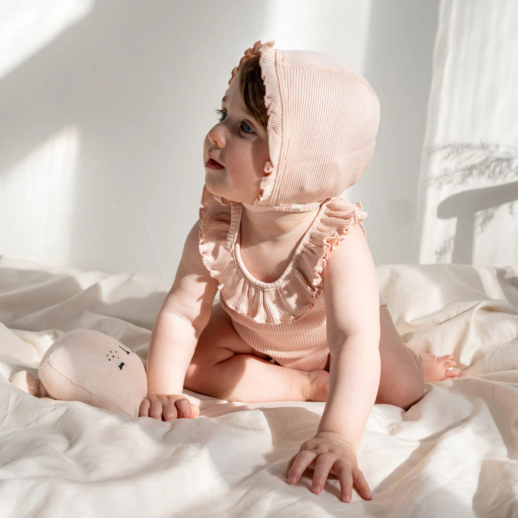 This soft baby bonnet is crafted from a in stretchable silk-cotton blend and adorned with delightful frills. This bonnet is designed with your baby's comfort and safety in mind, featuring straps that are limited to 14 cm.