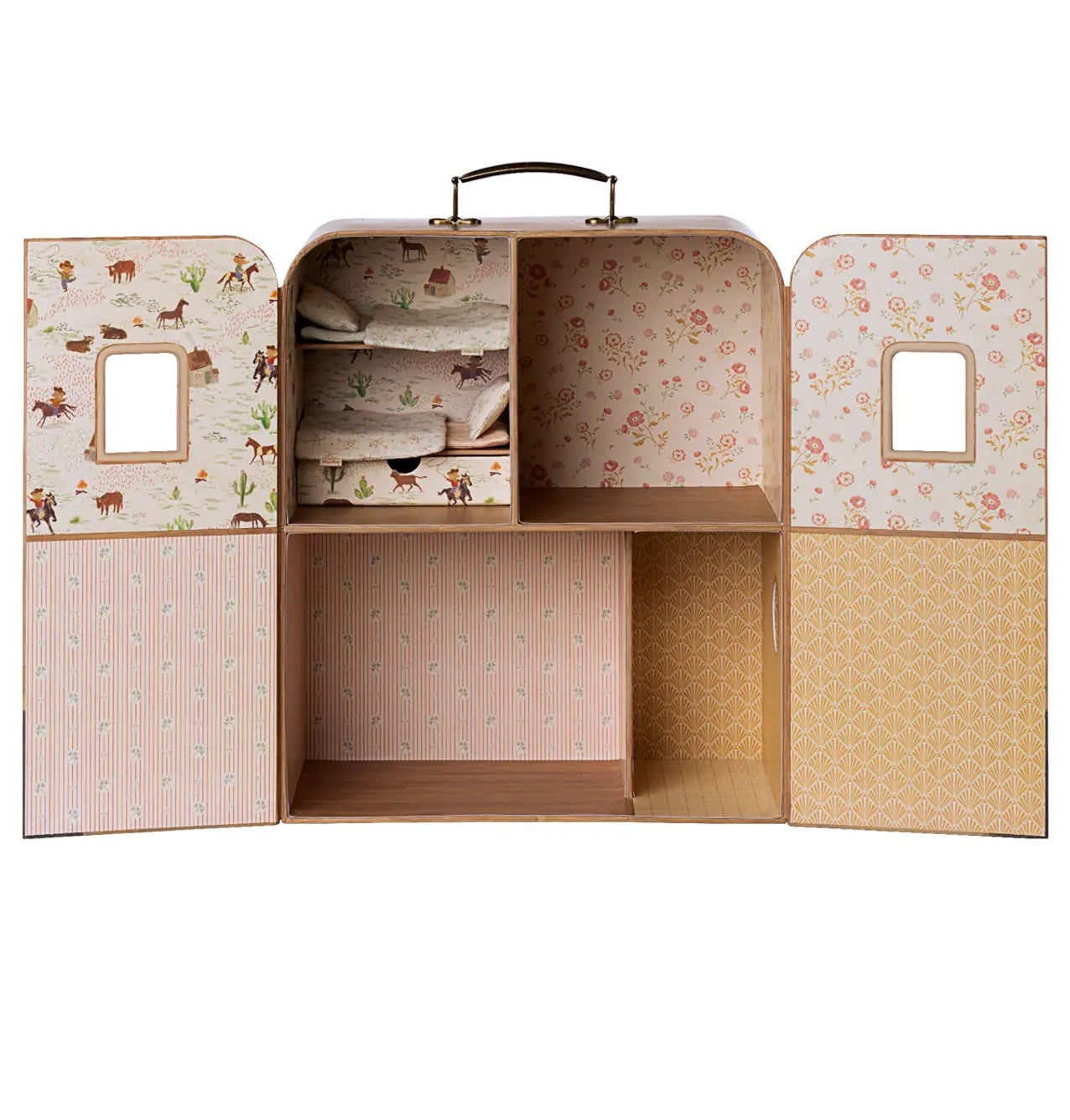 Welcome to the SuitCasa, a charming portable mouse house perfectly sized for Little Brother and Little Sister mice. With a convenient handle, it transforms into a suitcase when the magnetic doors are closed, making it easy to take your mice on adventures. Inside, two built-in beds with soft bedding provide a cosy place to sleep, and there is plenty of room to add small mouse-sized furniture and accessories to create a personalised, cosy home on the go.